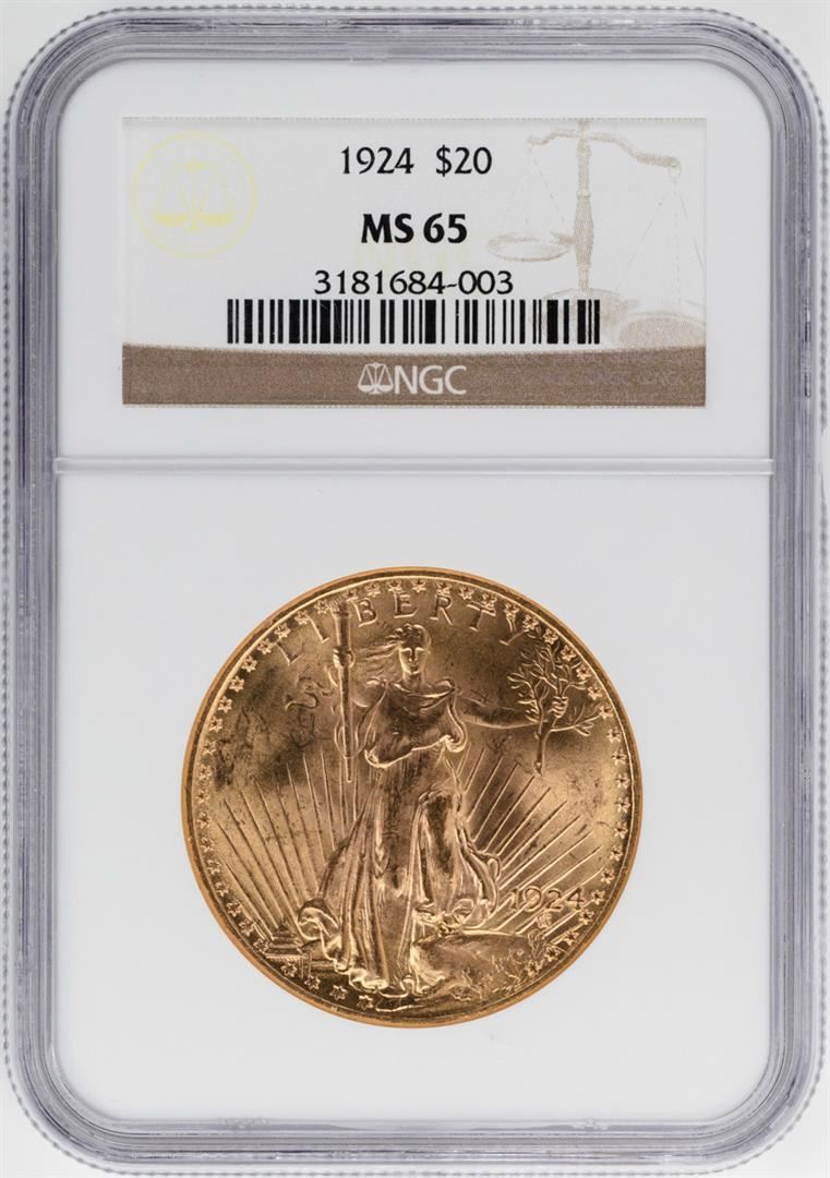 One 1924 $20 St. Gaudens Double Eagle Gold Coin NGC MS65. NGC Certified.