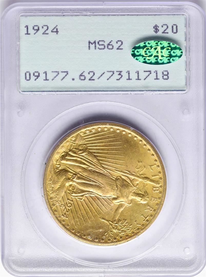 One 1924 $20 St. Gaudens Double Eagle Gold Coin PCGS MS62 CAC Old Rattler Holder. PCGS Graded.