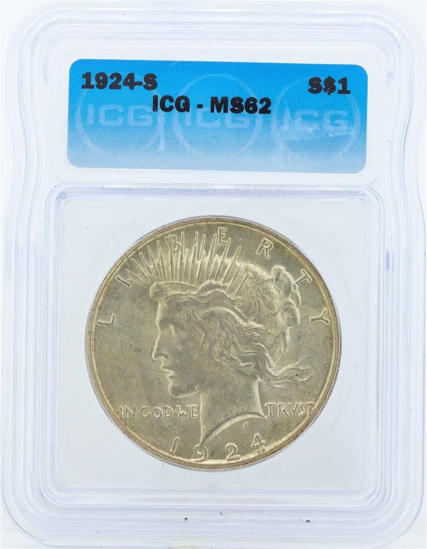 One 1924-S $1 Peace Silver Dollar Coin ICG MS62. ICG Certified.