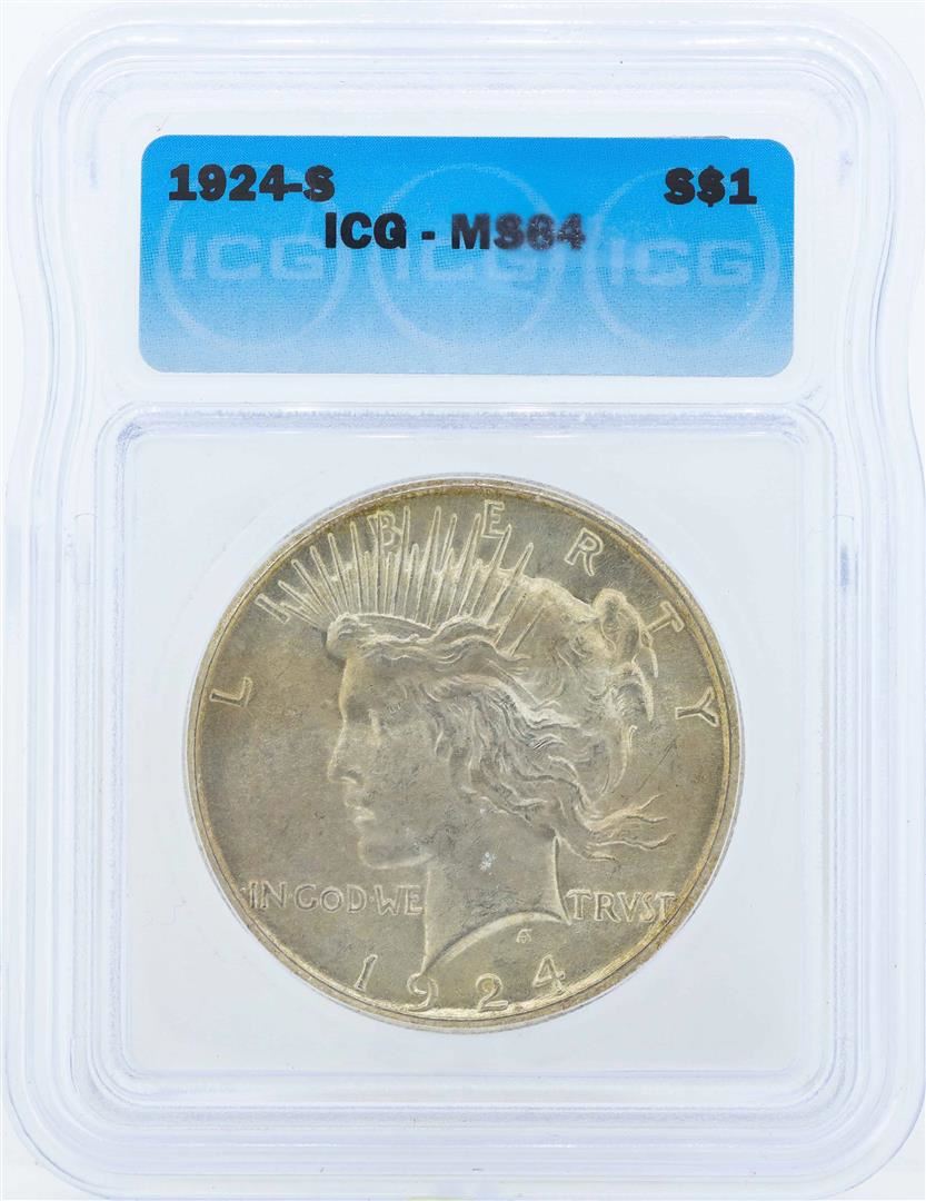 One 1924-S $1 Peace Silver Dollar Coin ICG MS64. ICG Certified.