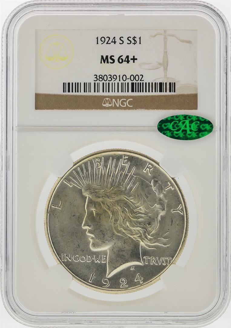 One 1924-S $1 Peace Silver Dollar Coin NGC Graded MS64+ CAC. NGC Certified.