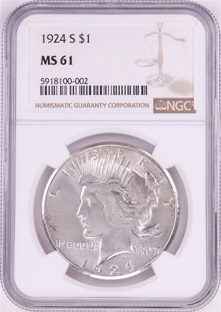 One 1924-S $1 Peace Silver Dollar Coin NGC MS61. NGC Certified.