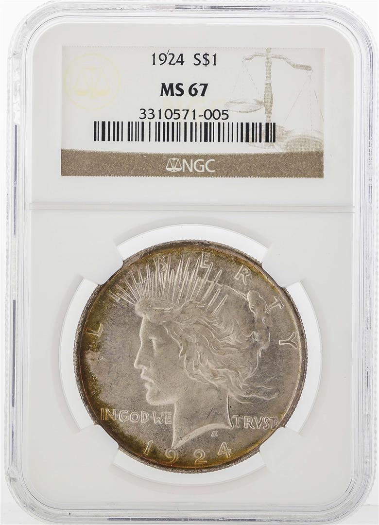 One 1924-S $1 Peace Silver Dollar Coin NGC MS67. NGC Certified.