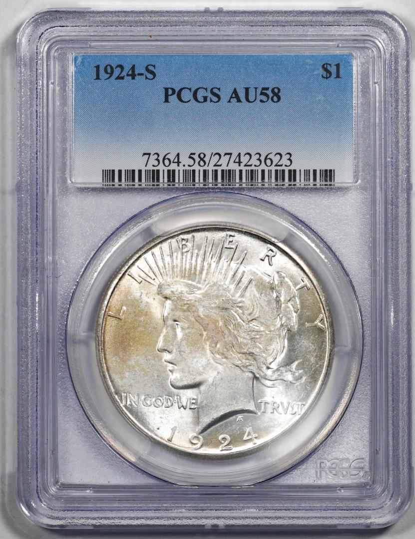 One 1924-S $1 Peace Silver Dollar Coin PCGS AU58.