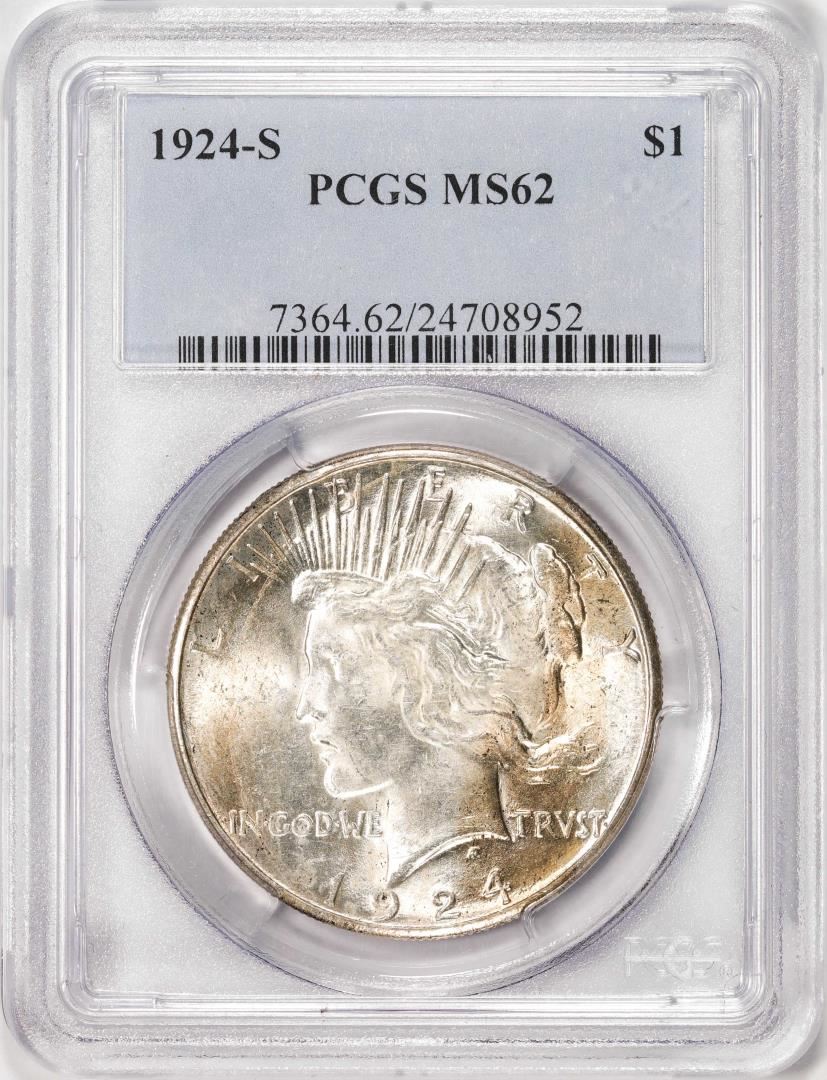 One 1924-S $1 Peace Silver Dollar Coin PCGS MS62. PCGS Graded.