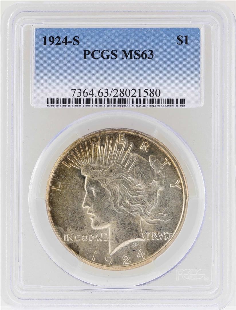 One 1924-S $1 Peace Silver Dollar Coin PCGS MS63. PCGS Graded.