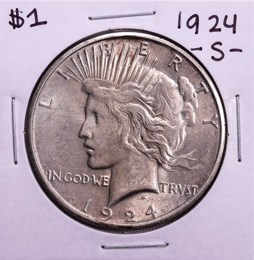 One 1924-S $1 Peace Silver Dollar Coin.
