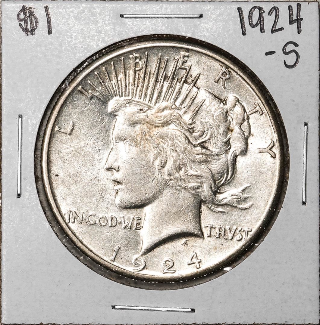 One 1924-S $1 Peace Silver Dollar Coin.