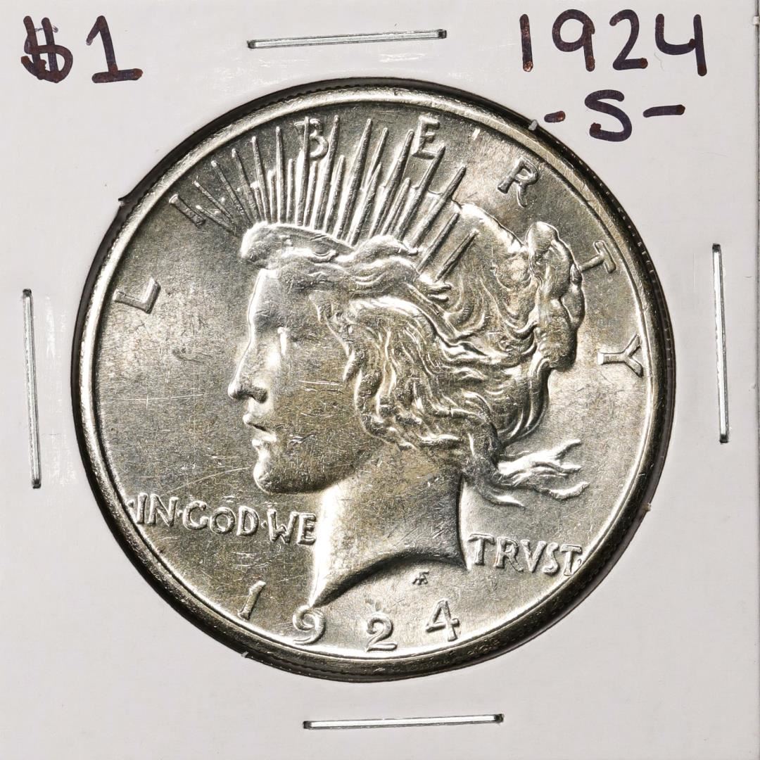 One 1924-S $1 Peace Silver Dollar Coin.