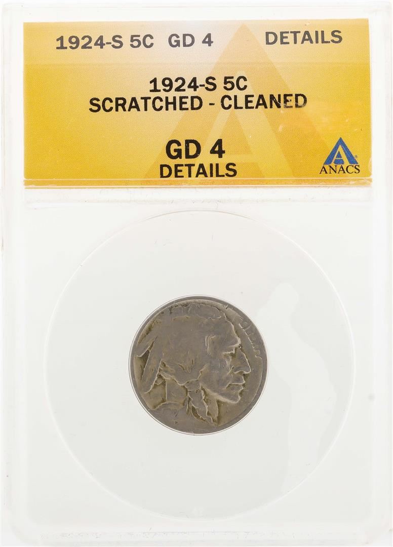 One 1924-S Buffalo Nickel Coin ANACS GD4 Details Scratched Cleaned. ANACS Certified.