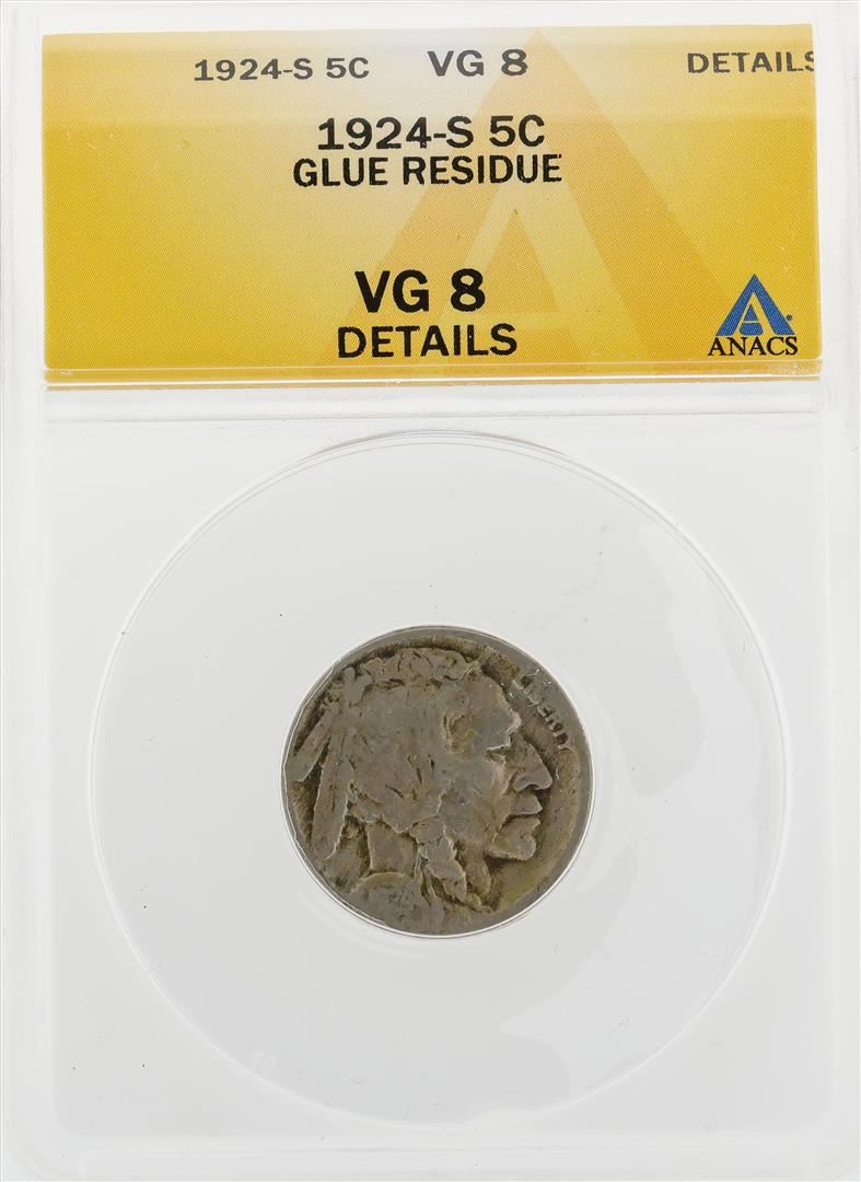 One 1924-S Buffalo Nickel Coin Glue Residue ANACS VG8 Details. ANACS Certified.