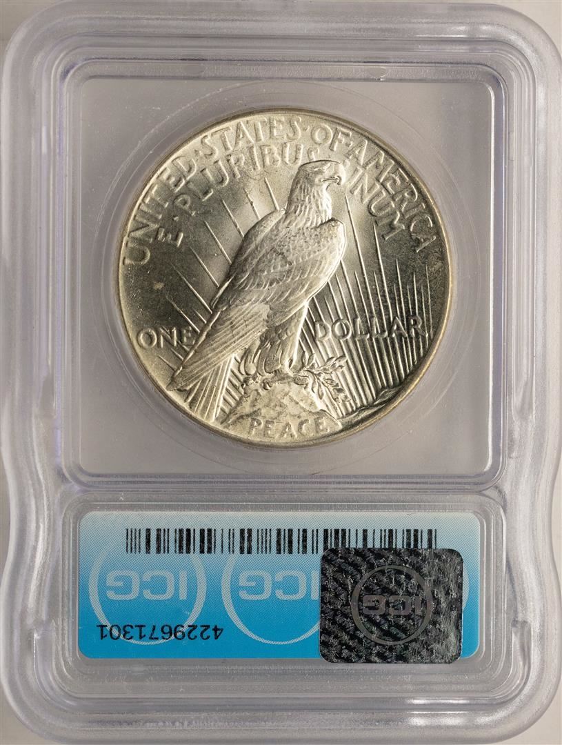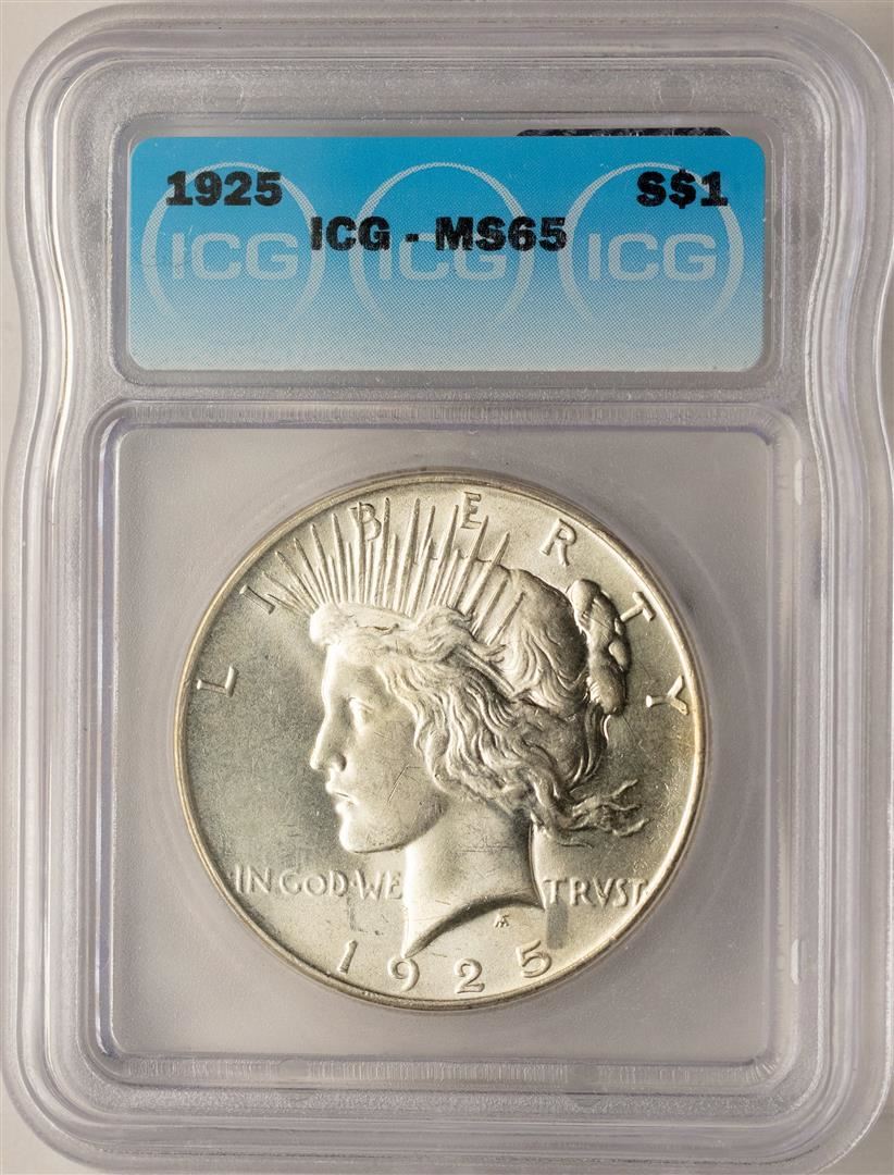 One 1925 $1 Peace Silver Dollar Coin ICG MS65. ICG Certified.