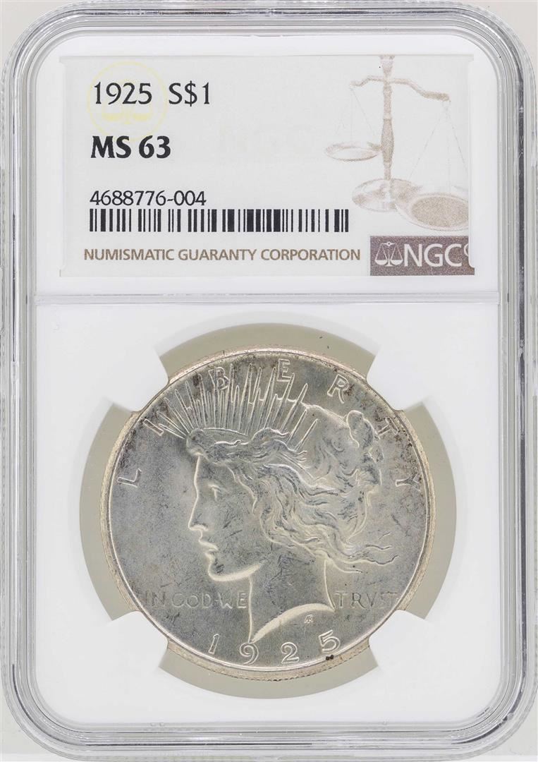 One 1925 $1 Peace Silver Dollar Coin NGC MS63. NGC Certified.