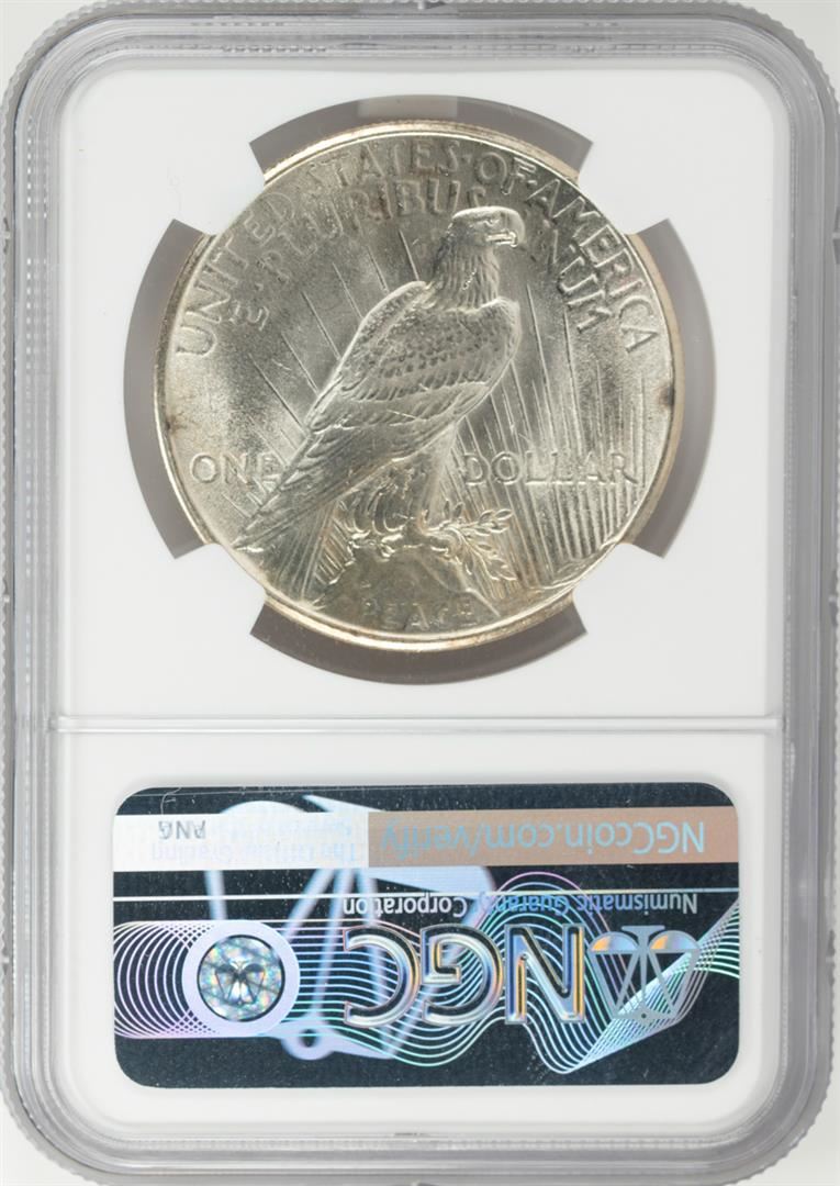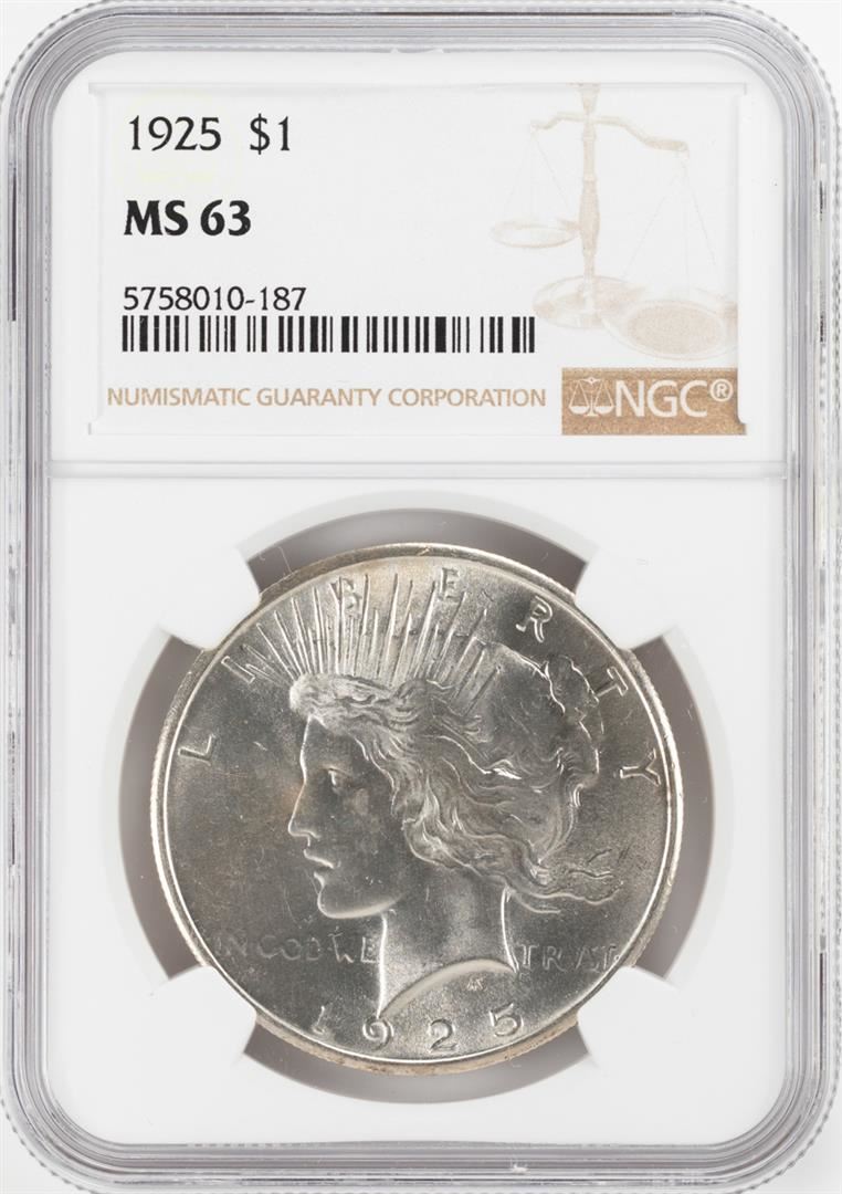 One 1925 $1 Peace Silver Dollar Coin NGC MS63. NGC Certified.