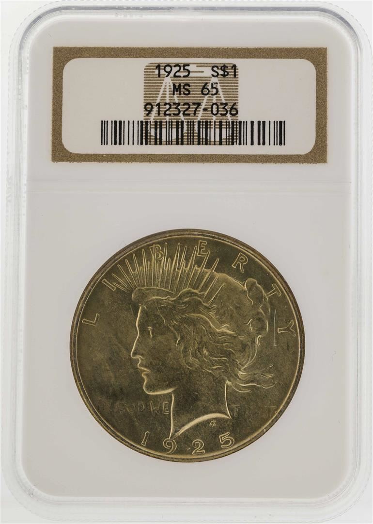One 1925 $1 Peace Silver Dollar Coin NGC MS65. NGC Certified.
