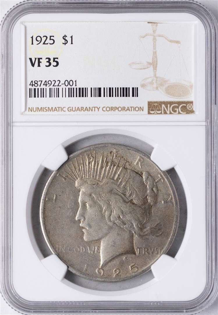 One 1925 $1 Peace Silver Dollar Coin NGC VF35. NGC Certified.