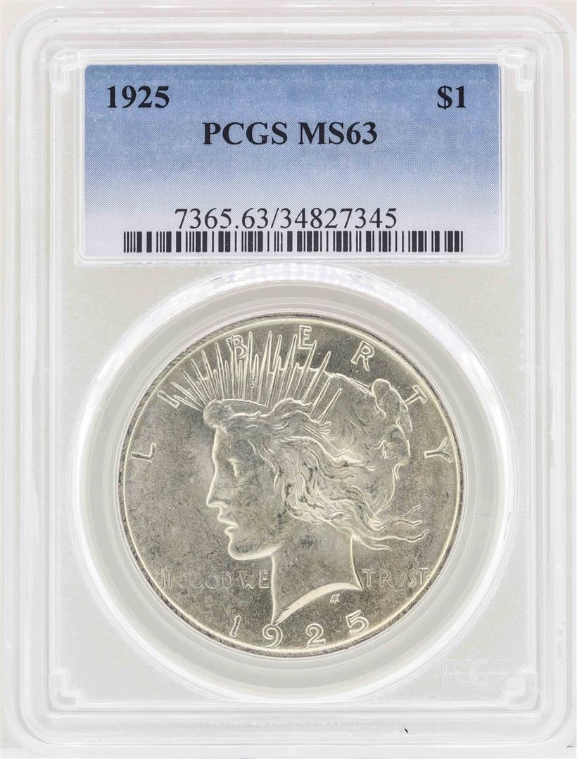 One 1925 $1 Peace Silver Dollar Coin PCGS MS63. PCGS Graded.