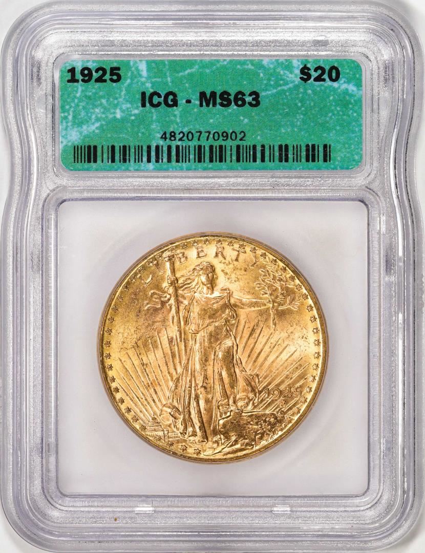 One 1925 $20 St. Gaudens Double Eagle Gold Coin ICG MS63. ICG Certified.