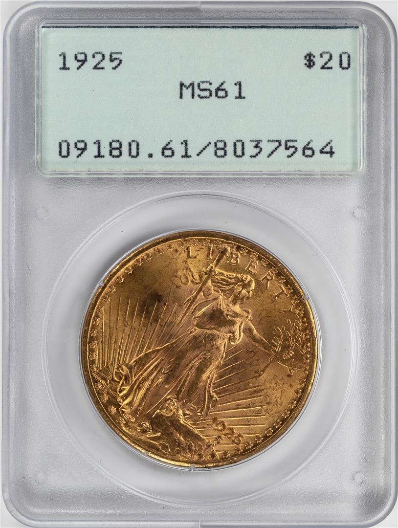 One 1925 $20 St. Gaudens Double Eagle Gold Coin PCGS MS61 Green Rattler Holder. PCGS Graded.