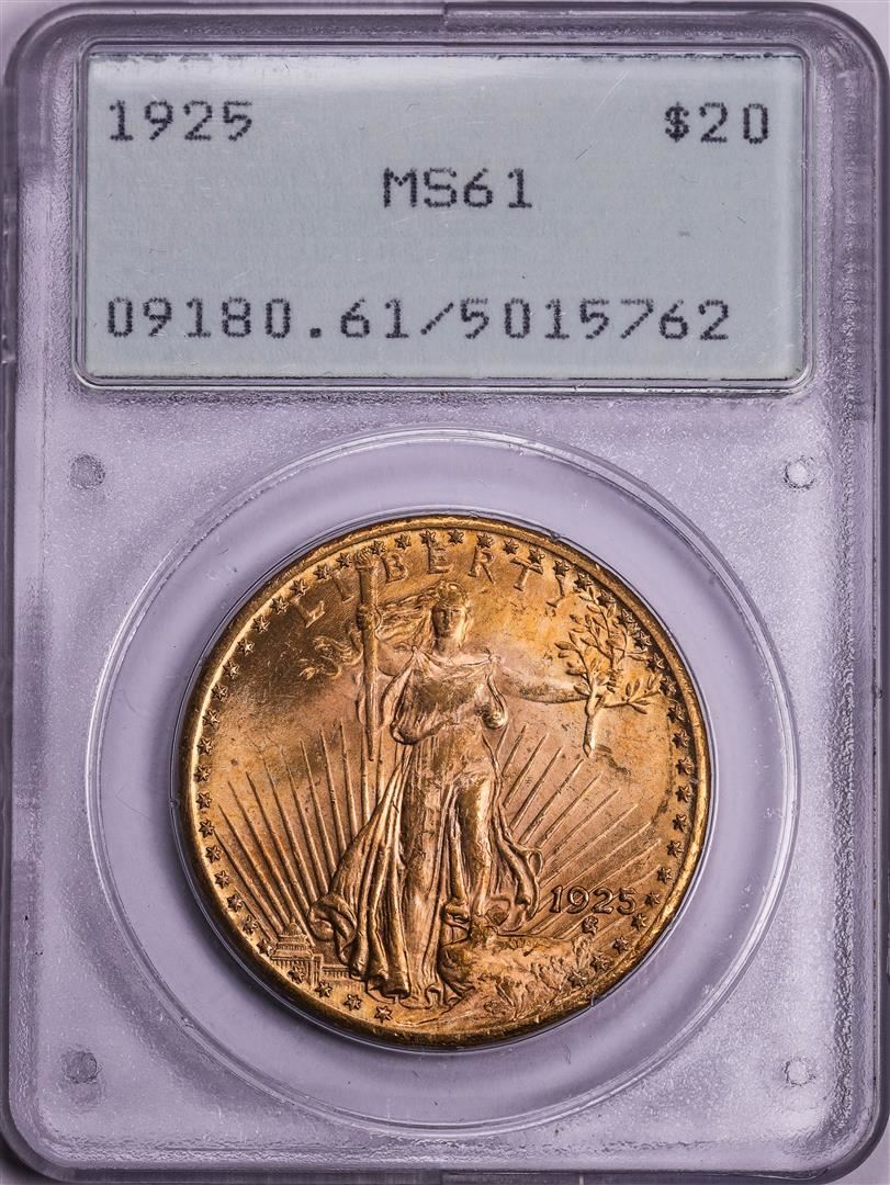 One 1925 $20 St. Gaudens Double Eagle Gold Coin PCGS MS61 Old Green Rattler Holder. PCGS Graded.