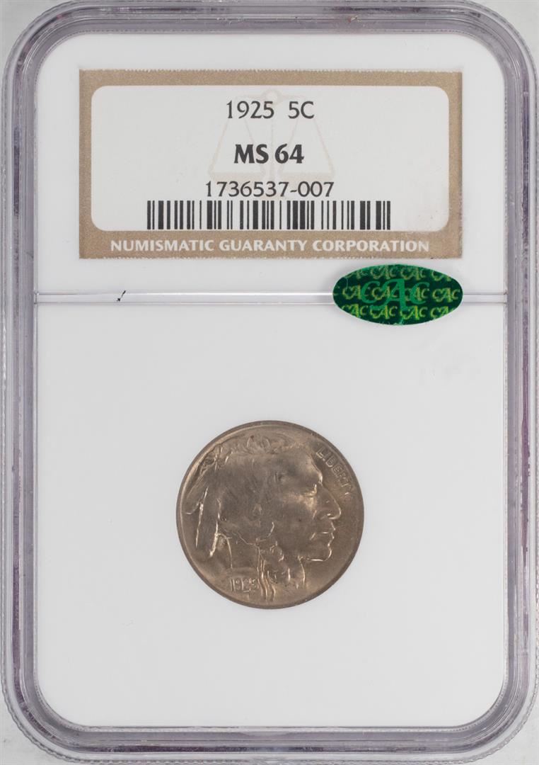 One 1925 Buffalo Nickel Coin NGC MS64 CAC. NGC Certified.