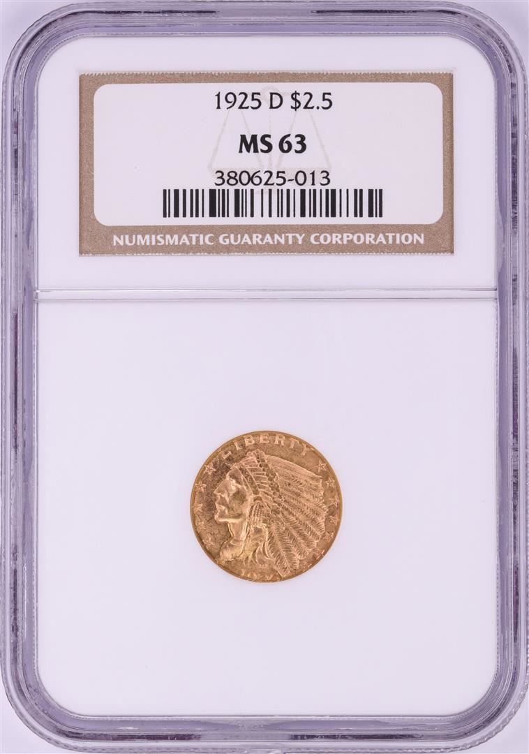 One 1925-D $2 1/2 Indian Head Gold Coin NGC MS63. NGC Certified.