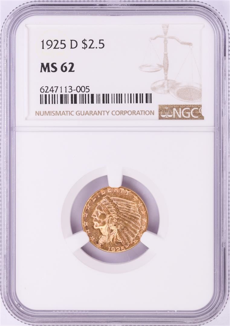 One 1925-D $2 1/2 Indian Head Quarter Eagle Gold Coin NGC MS62. NGC Certified.