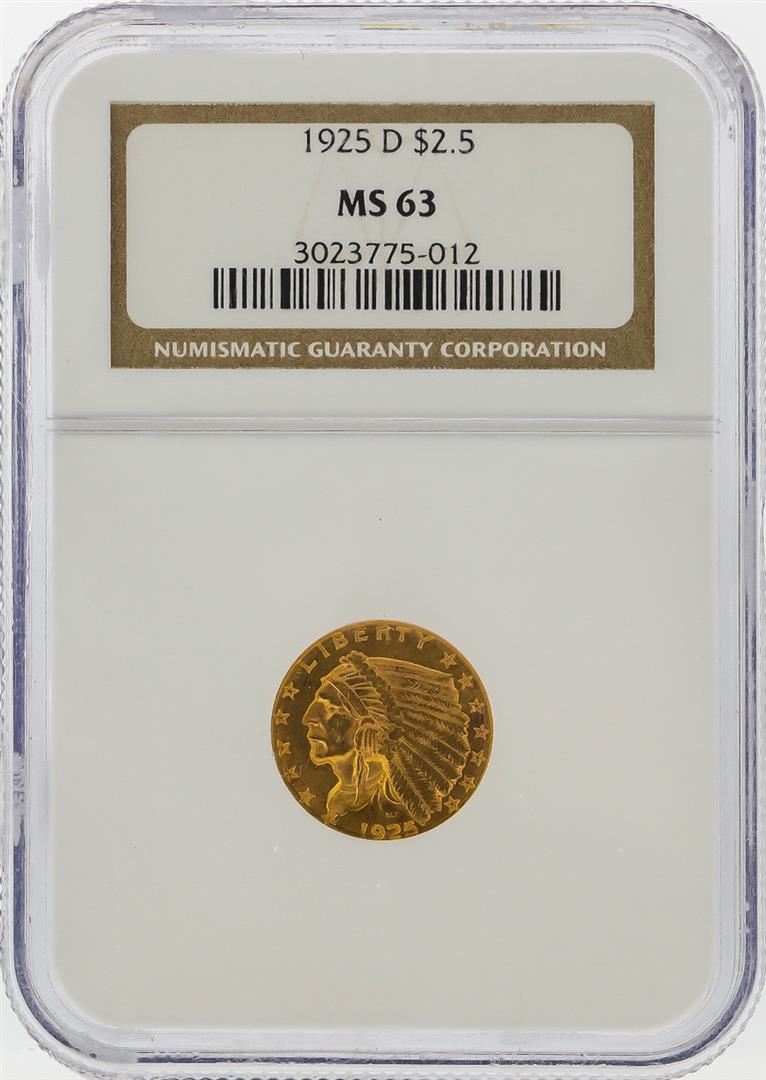 One 1925-D $2 1/2 Indian Head Quarter Eagle Gold Coin NGC MS63. NGC Certified.