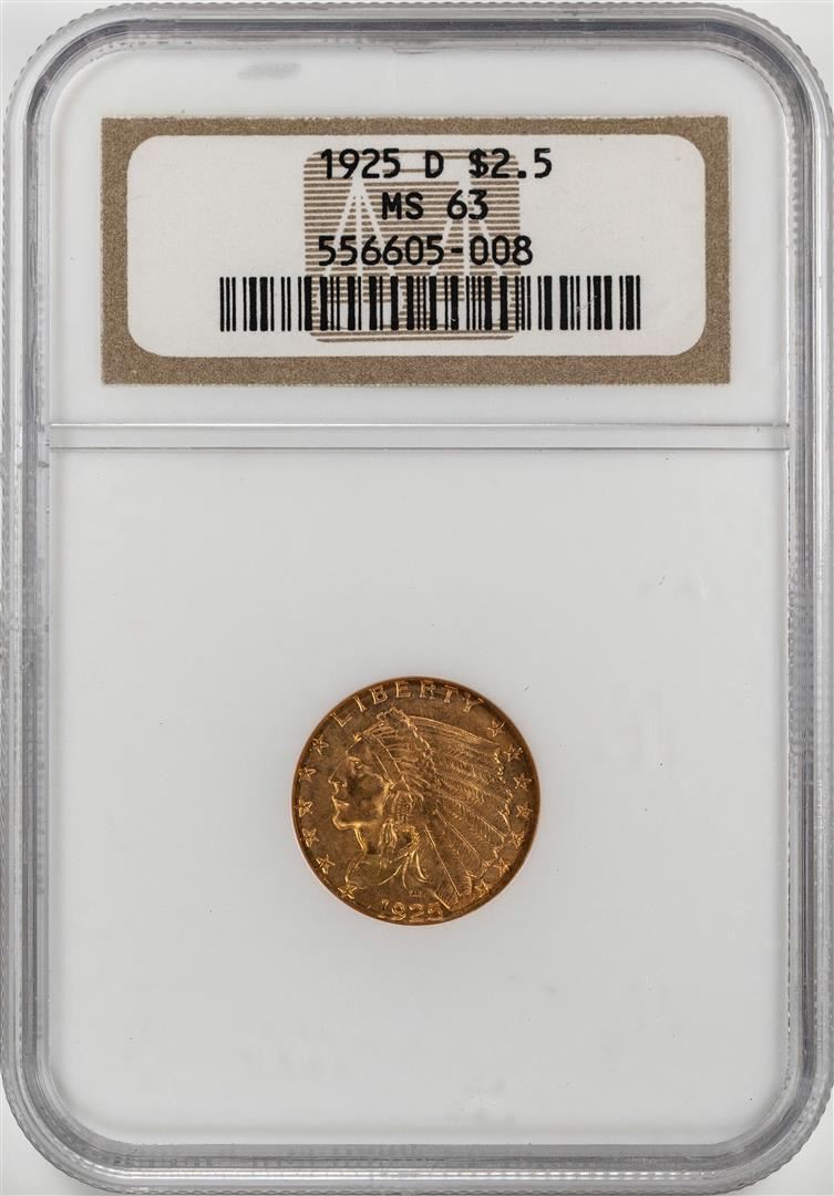 One 1925-D $2 1/2 Indian Head Quarter Eagle Gold Coin NGC MS63. NGC Certified.