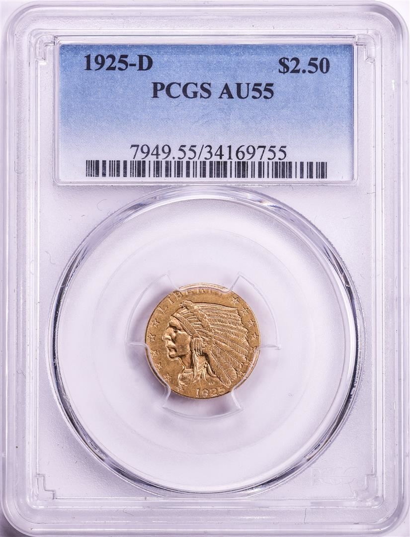 One 1925-D $2 1/2 Indian Head Quarter Eagle Gold Coin PCGS AU55. PCGS Graded.