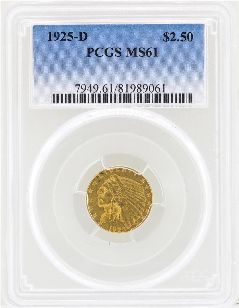 One 1925-D $2 1/2 Indian Head Quarter Eagle Gold Coin PCGS MS61. PCGS Graded.
