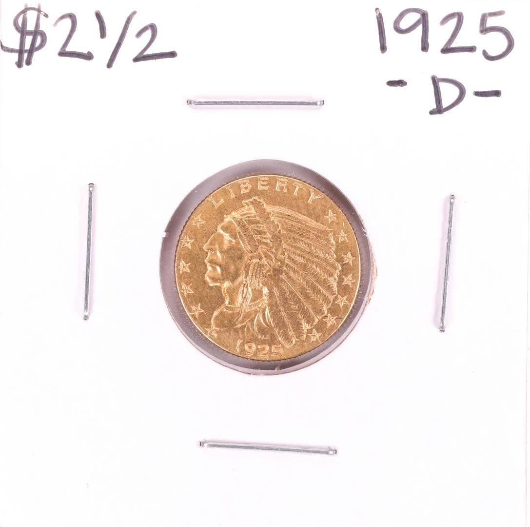 One 1925-D $2 1/2 Indian Head Quarter Eagle Gold Coin.
