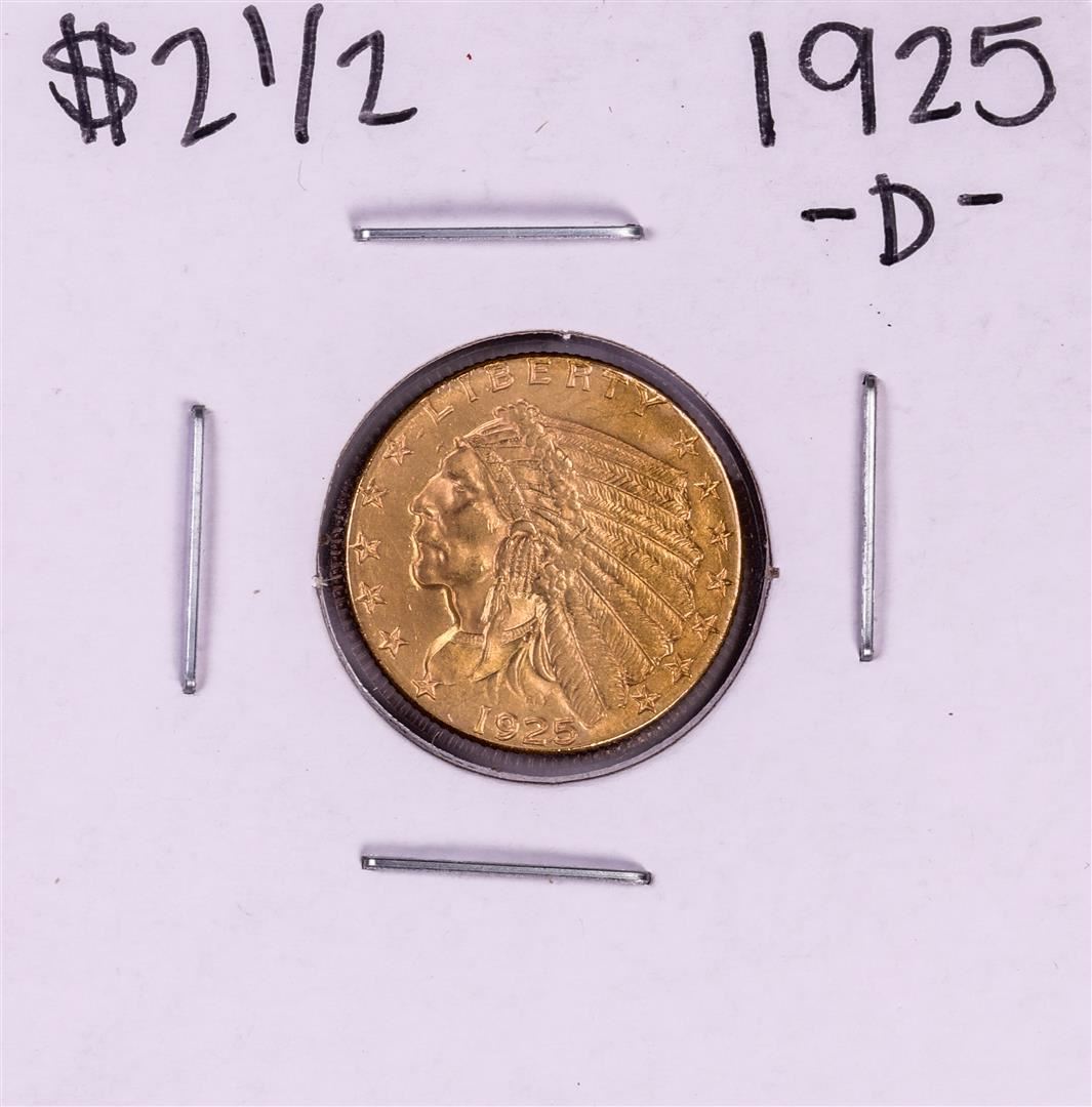One 1925-D $2 1/2 Indian Head Quarter Eagle Gold Coin.