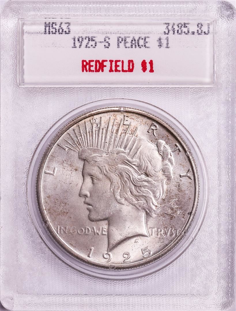 One 1925-S $1 Peace Silver Dollar Coin Blanchard MS63 Redfield Holder.