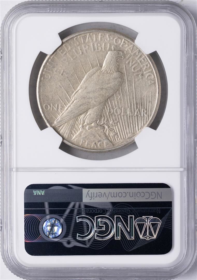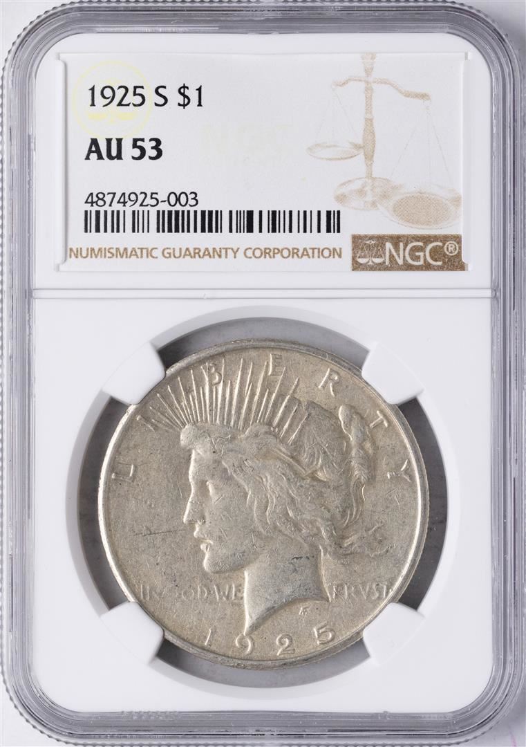 One 1925-S $1 Peace Silver Dollar Coin NGC AU53. NGC Certified.