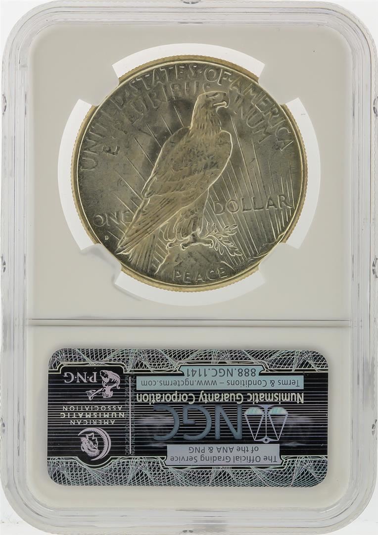 1925-S $1 Peace Silver Dollar Coin NGC Graded MS65. The bright complexion of this stunning coin shows the slightest vanilla hues at center but fades to a platinum brilliance on both sides. Attractively original and even mattelike in some areas, the surfaces are well-composed and display unbroken luster. This mintage is quite common in circulated and lower Mint State grades, however the 1925-S is considered a true condition rarity at the Gem level and above. This rare coin is a great opportunity to for any peace dollar or rare coin collector. NGC Certified.
