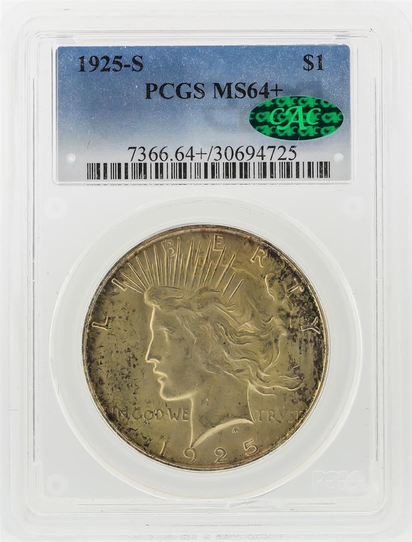 One 1925-S $1 Peace Silver Dollar Coin PCGS Graded MS64+ CAC. PCGS Graded.