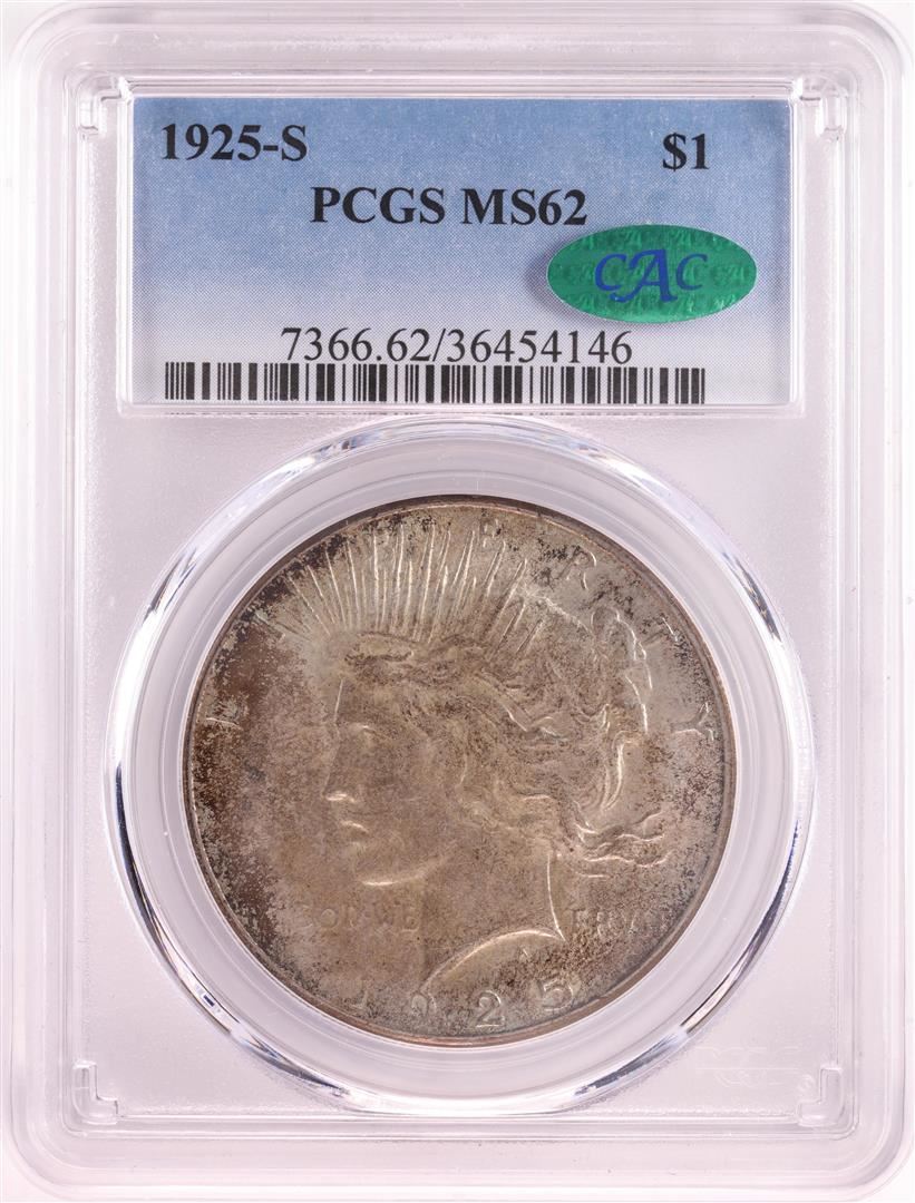 One 1925-S $1 Peace Silver Dollar Coin PCGS MS62 CAC. PCGS Graded.
