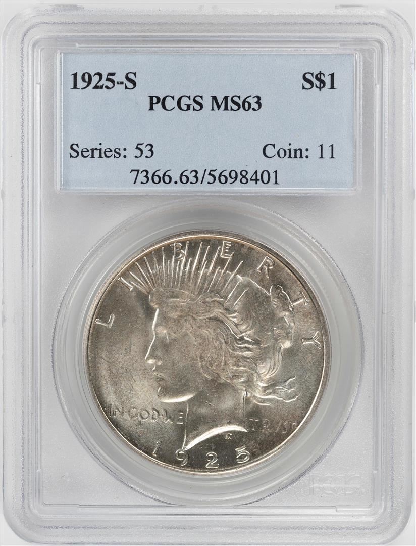 One 1925-S $1 Peace Silver Dollar Coin PCGS MS63. PCGS Graded.