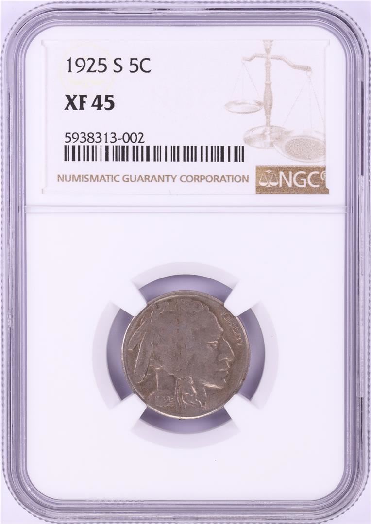 One 1925-S Buffalo Nickel Coin NGC XF45. NGC Certified.