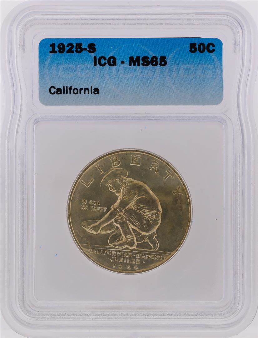 One 1925-S Half Dollar California Diamond Jubilee Commemorative Coin ICG Graded MS65. ICG Certified.