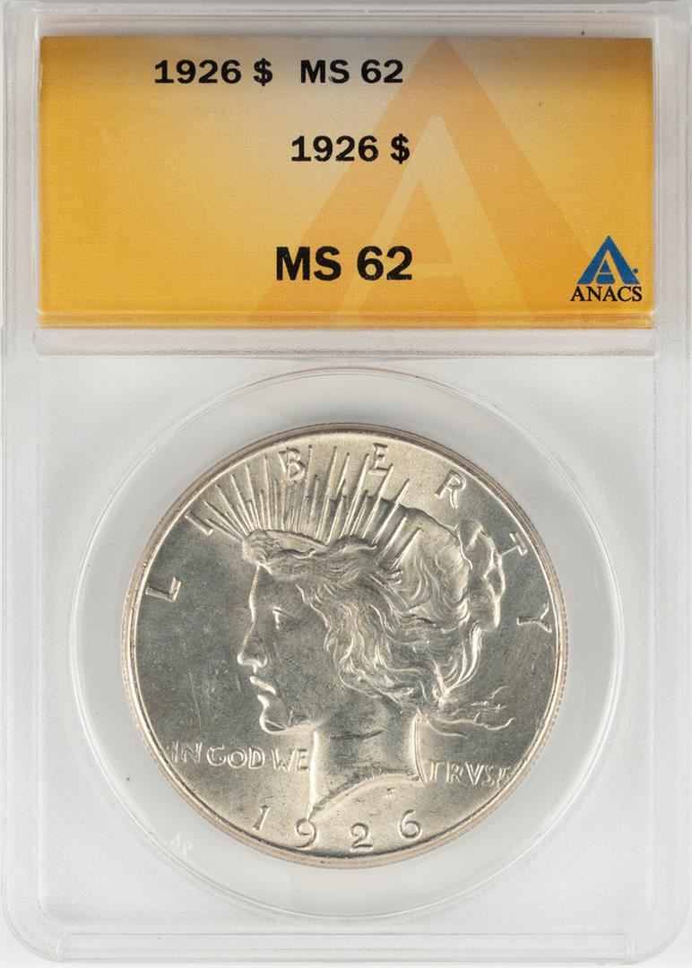 One 1926 $1 Peace Silver Dollar Coin ANACS MS62. ANACS Certified.