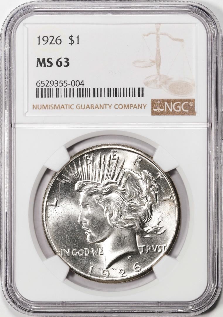 One 1926 $1 Peace Silver Dollar Coin NGC MS63. NGC Certified.