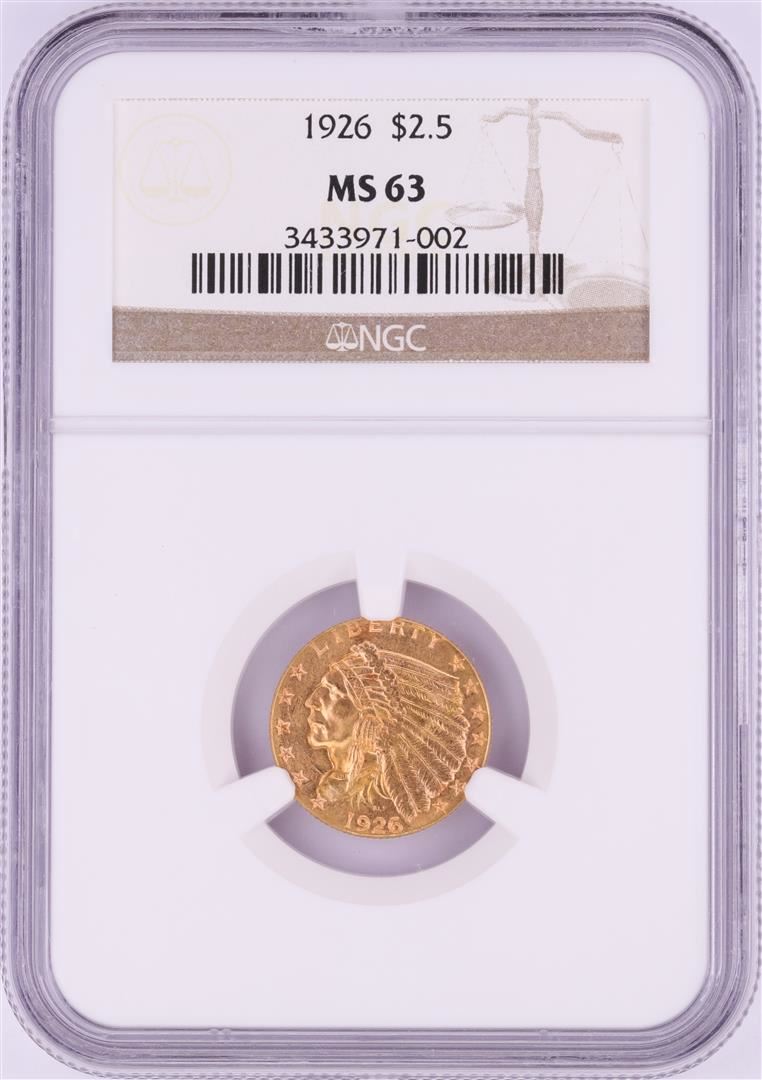 One 1926 $2 1/2 Indian Head Gold Coin NGC MS63. NGC Certified.