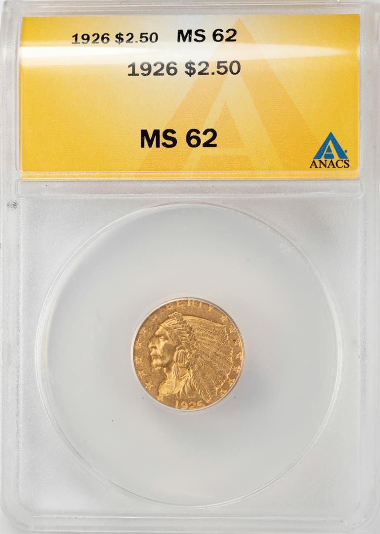One 1926 $2 1/2 Indian Head Quarter Eagle Gold Coin ANACS MS62. ANACS Certified.
