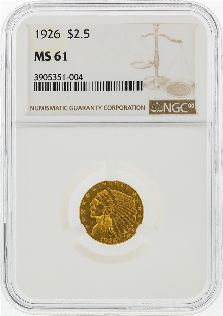 One 1926 $2 1/2 Indian Head Quarter Eagle Gold Coin NGC MS61. NGC Certified.