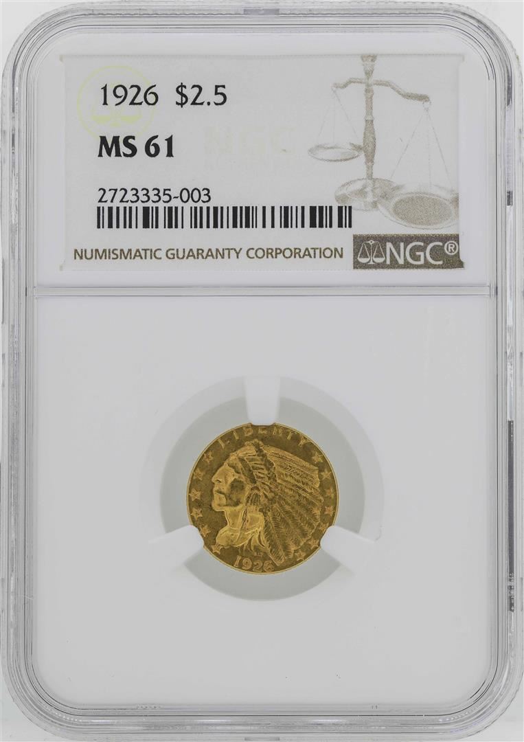One 1926 $2 1/2 Indian Head Quarter Eagle Gold Coin NGC MS61. NGC Certified.