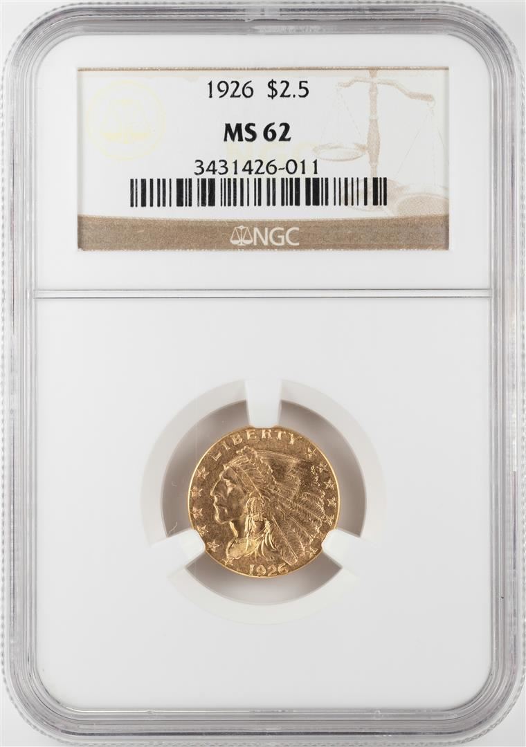 One 1926 $2 1/2 Indian Head Quarter Eagle Gold Coin NGC MS62. NGC Certified.