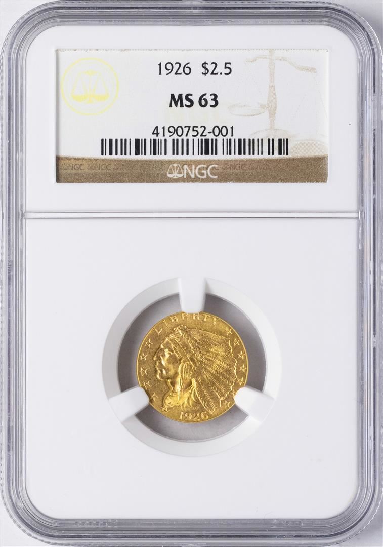 One 1926 $2 1/2 Indian Head Quarter Eagle Gold Coin NGC MS63. NGC Certified.