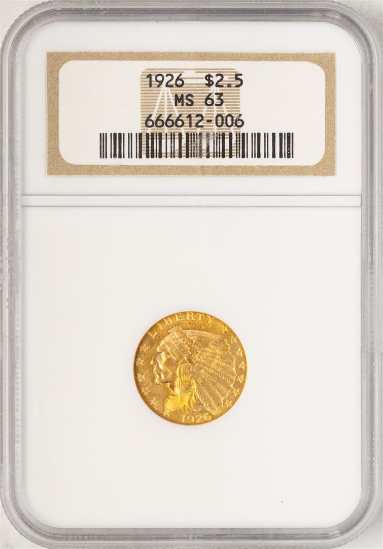 One 1926 $2 1/2 Indian Head Quarter Eagle Gold Coin NGC MS63. NGC Certified.